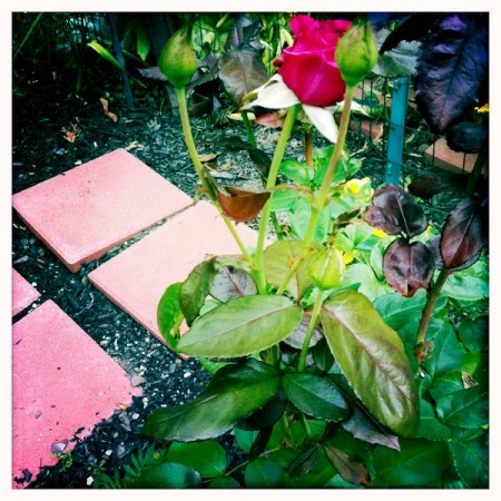Yesterday, I cut a few of my roses for a bouquet. First of all, I can’t believe I went so long without rose bushes. The two varieties I chose this year, both in various shades of plum, are so pretty and have an amazing, spicy fragrance. Secondly, I absolutely love using mason jars for vases. I think they make such a casual statement when filled with flowers, especially roses. I’ve already decided that my next garden is going to have many rose bushes. I’m just completely taken with them. I want to be able to cut as many as I like for bouquets, but still have some to enjoy in the garden. This is going to require several more plants!